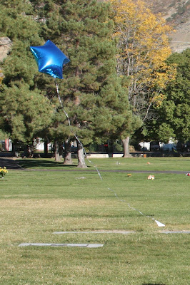 At 4:15, Dan and I met in the cemetery where ten of our friends and a couple handful of kids surrounded us. The 65 degree weather was perfectly warm but not too hot as we took turns writing notes of love attached to the balloons, while Josh Groban played from a car stereo. After lighting some candles and singing Happy Birthday to Ty, Dan and I blew out the candles (or the wind did, rather) and then we let go of all the balloons. In a large group, the balloons ascended slowly, sparkling as they caught the glint of the gorgeous sunlight. As the wind carried them northward, they gradually spread out in different directions. We watched them quietly until we could no longer detect the twinkling in the sky--all except for one. We laughed in dismay, noting that the only balloon to get it's string caught in a tree was the Happy Birthday balloon with the note from Dan and me. Dan tried shaking the tree, since jumping for it was useless. It was too young of a tree to have branches to climb on, but too tall that we couldn't reach it! Dan and I promised to come back for it later.